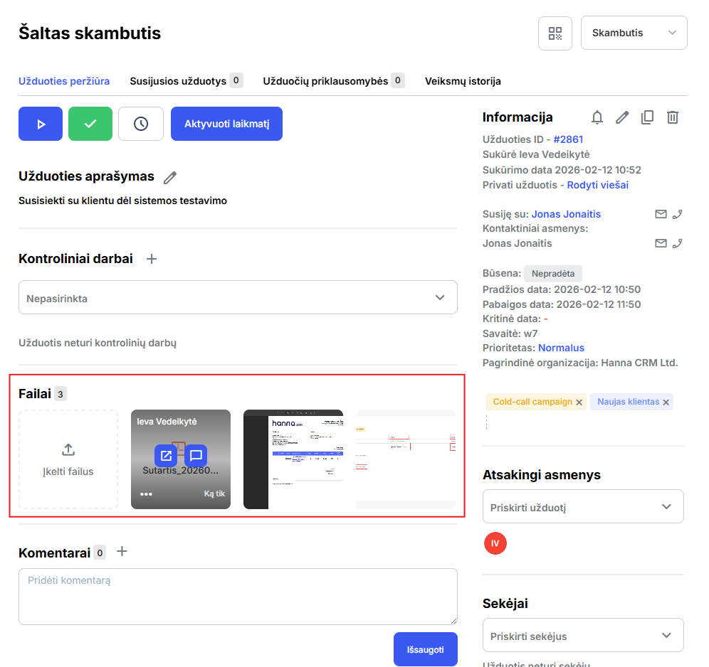 Sistemoje buvo atnaujinta užduočių failų skiltis - nuo šiol įrašai rodomi specialioje Failai skiltyje. Tai patogesnis būdas matyti visus su užduotimi susijusius failus, nuotraukas ir įrašus vienoje vietoje, tad nereiks keliauti per komentarus kol rasite ieškomą įrašą.