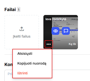 Prie failo pelyte paslinkę į kairę, matysite tris taškelius su papildomomis opcijos failą ištrinti, atsisiųsti arba kopijuoti failo nuorodą.