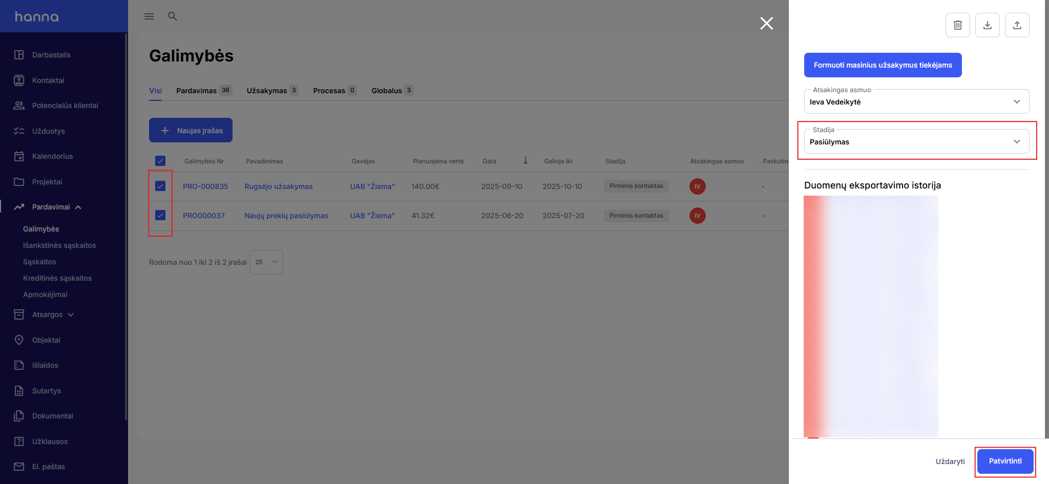 Šis pakeitimas leidžia masiniu būdu pakeisti galimybių stadijas pasirinktiems įrašams. Galimybių sąraše pažymėkite reikiamus įrašus, tuomet rinkitės masinių veiksmų mygtuką. Laukelyje Stadija nurodykite į kurią stadiją keisite įrašus ir išsaugokite.