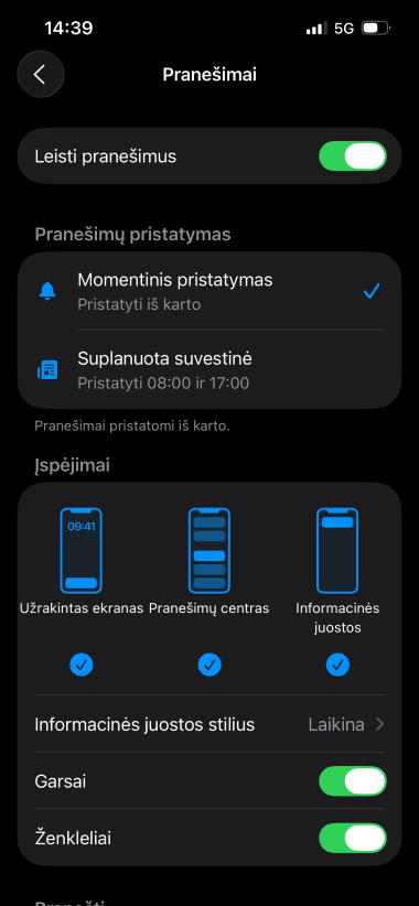 - Pirmiausia įsitikinkite, kad įjungtas leidimas gauti pranešimus iš Mobilios stoteles. Tai rasite įrenginio Pranešimų nustatymuose (en. Notifications).