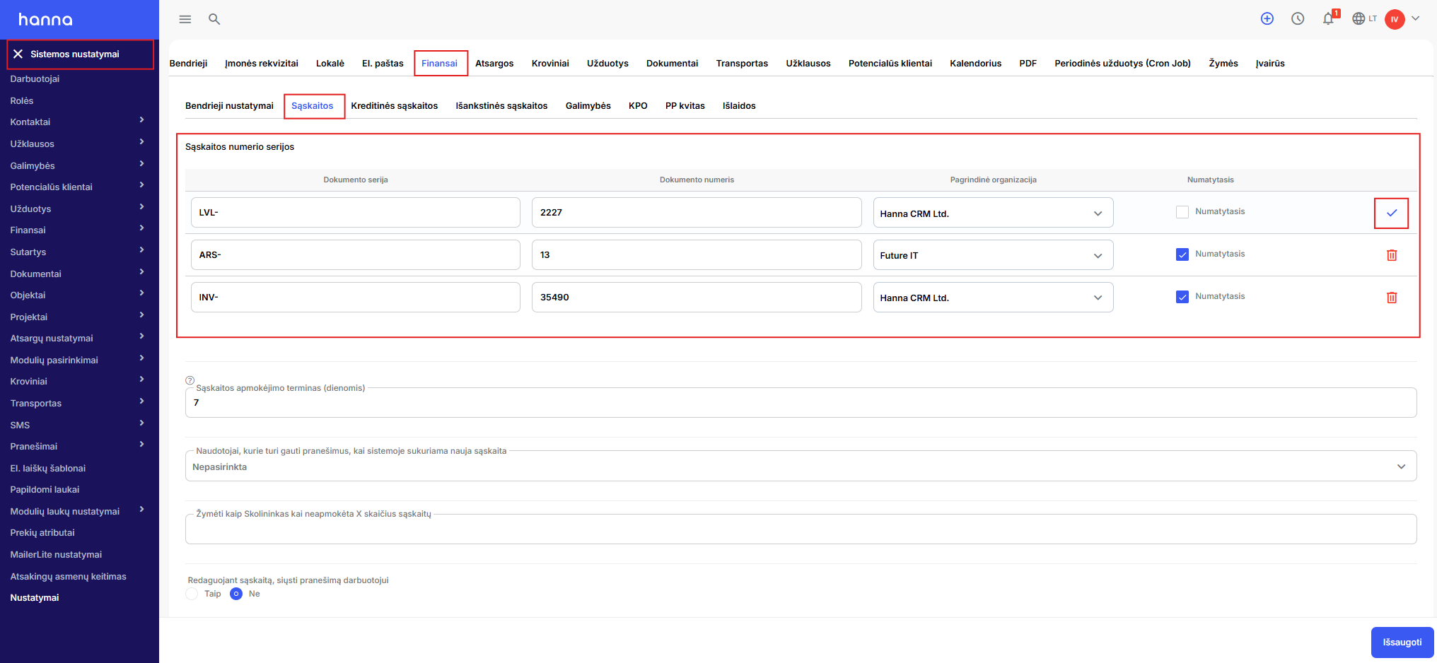 Sistemos nustatymai - Nustatymai - Finansai - Sąskaitos - šiuose nustatymuose galite valdyti: