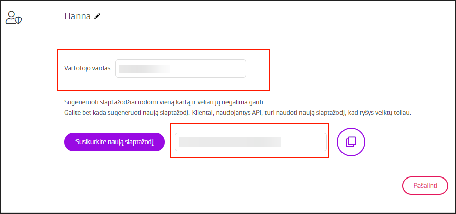 - Nukopijuokite Vartotojo vardą bei Slaptažodį ir šiuos duomenis atsiųskite mums el. paštu support@hannacrm.eu su prašymų įgalinti Telia Smart Connect integraciją: