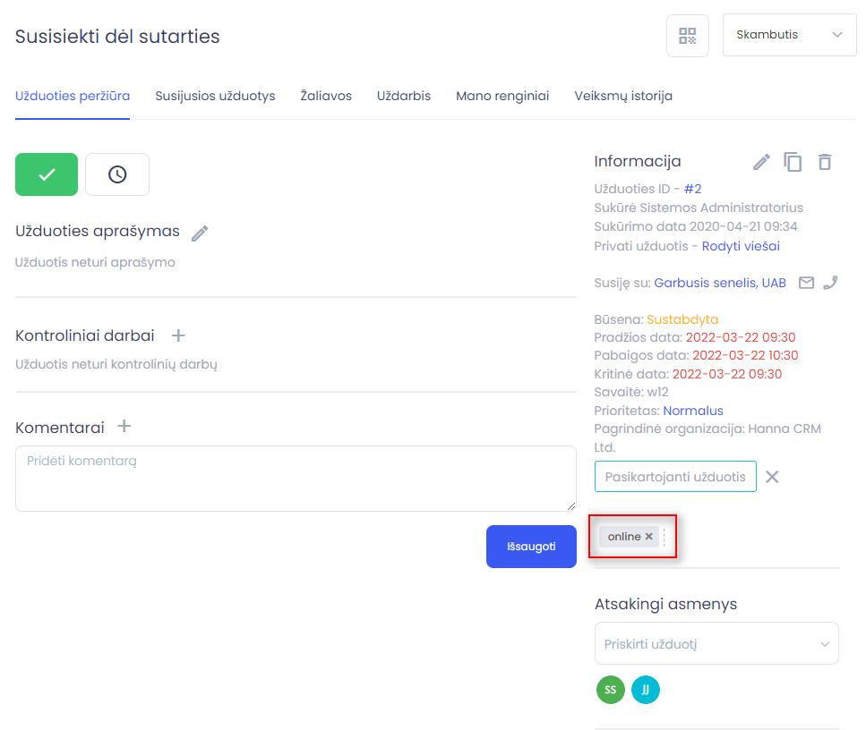 Pavyzdžiui: užduoties peržiūroje galite įvesti tekstą prie žymos ir ji bus automatiškai sukurta: